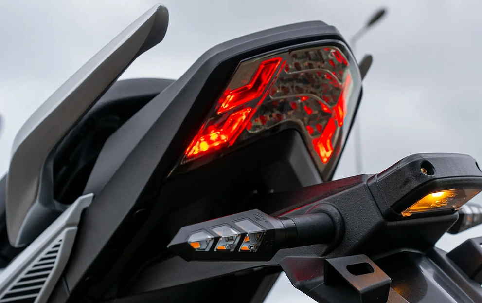 Protetor de escapamento, porta USB, cavalete central e descanso lateral.