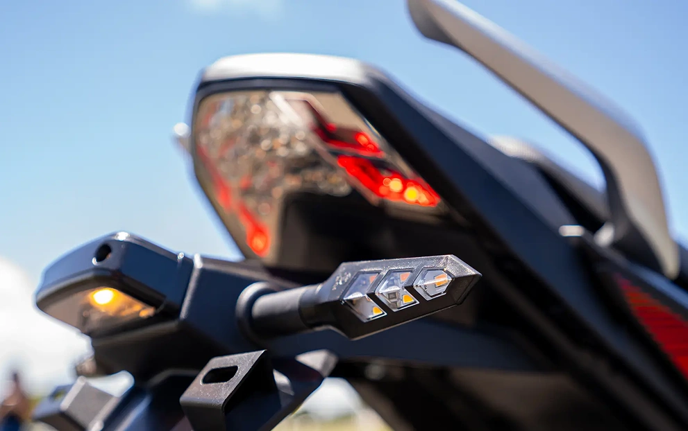 Protetor de escapamento, porta USB, cavalete central e descanso lateral.
