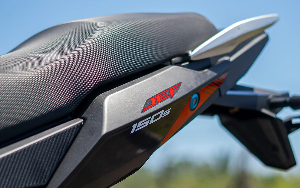 Na parte traseira, conta com balança monoamortecedora (monoshock), absorvendo impactos de maneira eficiente e garantindo maior estabilidade durante a pilotagem. Na parte dianteira, a JEF150s EFI conta com garfo telescópico, que proporciona maior rigidez e controle, resultando em uma condução mais precisa.