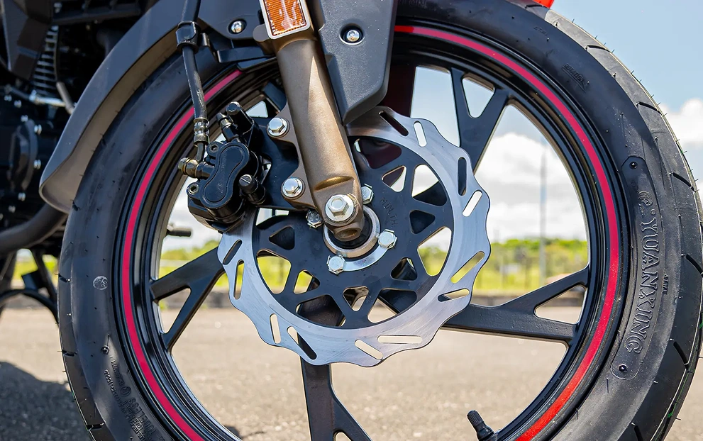A JEF 150s EFI conta com rodas de liga leve aro 17”, garantindo mais estabilidade e aderência ao solo, ideal para diferentes tipos de terreno. Além disso, conta com o freio dianteiro à disco, oferecendo uma frenagem mais eficiente e rápida.