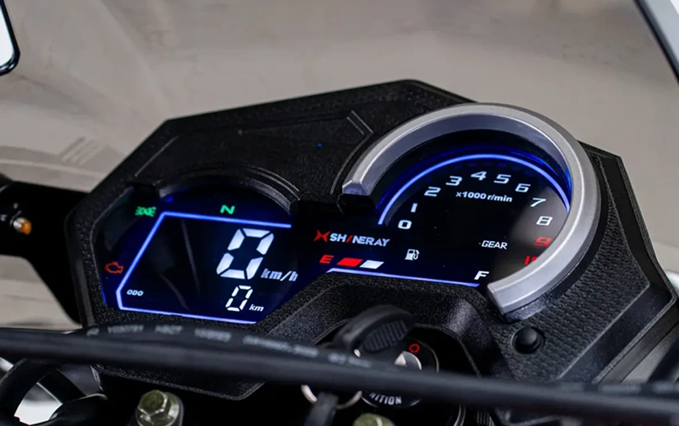 O painel da SHI 175 é 100% digital, oferecendo uma visão clara das informações essenciais. Ele exibe o indicador de combustível, velocidade, marcha, neutro, conta giros, pisca alerta e lampejador de farol. O painel proporciona praticidade e segurança, garantindo que todas as informações necessárias fiquem visíveis ao alcance dos olhos.