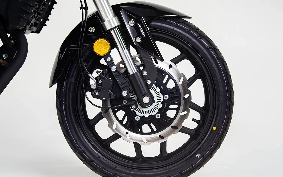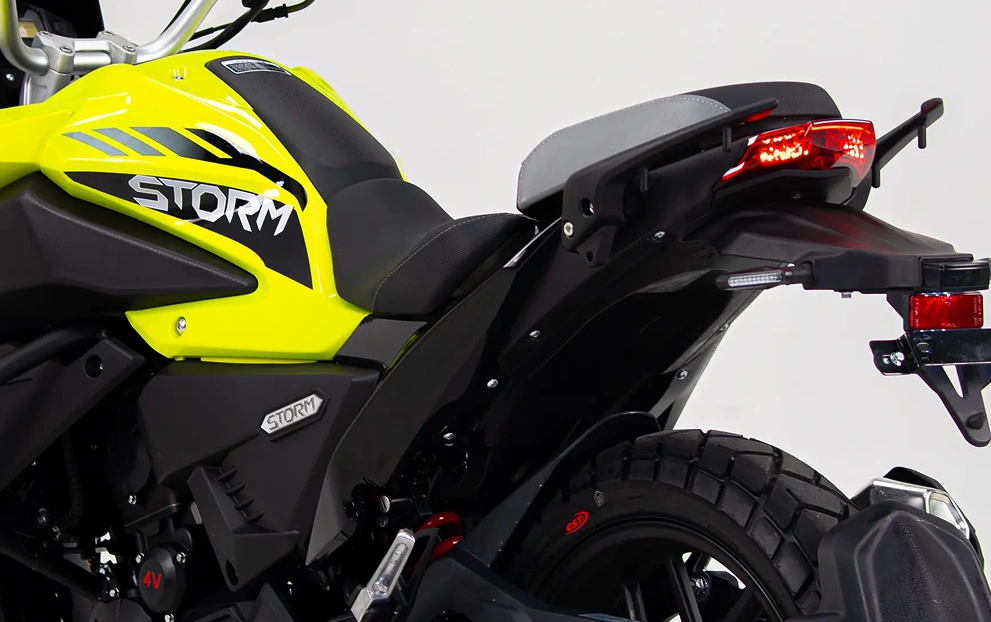 A STORM é equipada com rodas de liga leve, que oferecem um excelente equilíbrio entre resistência e leveza. As rodas, tanto dianteiras quanto traseiras, possuem aro 17”, garantindo mais estabilidade e aderência ao solo, ideal para diferentes tipos de terreno. Seus freios à disco, tanto na frente quanto atrás, contam com o avançado sistema ABS de dois canais, que evita o travamento das rodas em frenagens mais bruscas, garantindo maior segurança e controle. Um conjunto que combina desempenho e tecnologia.