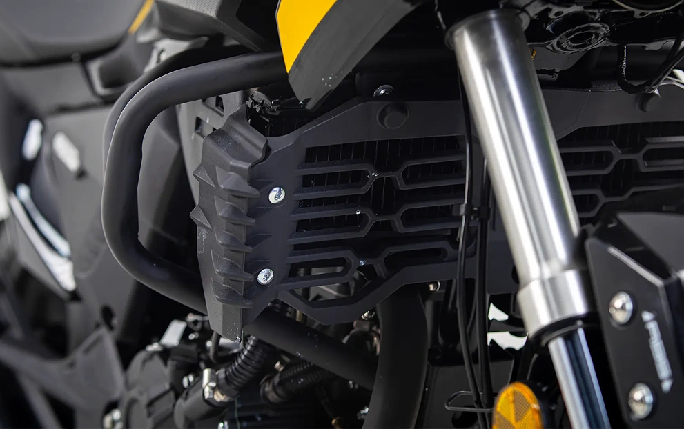 Na parte dianteira, conta com garfo telescópico invertido, que proporciona maior rigidez e controle, resultando em uma condução mais precisa. Já a suspensão traseira é equipada com balança monoamortecedora (monoshock), absorvendo impactos de maneira eficiente e garantindo maior estabilidade durante a pilotagem. Um conjunto que une tecnologia e conforto, ideal para aventuras e trajetos desafiadores.